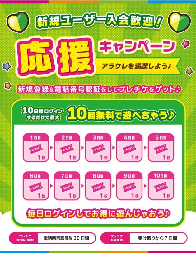 アラクレは新規登録・電話番号認証を完了させるだけで「無料チケット最大10枚」が手に入ります!