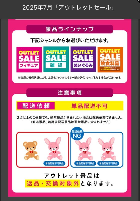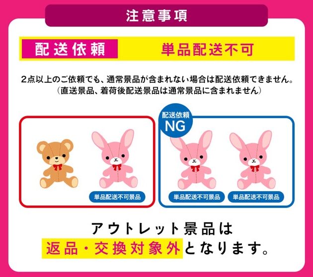 ただ1つだけ注意点を挙げておくと、ごく1部の景品種(アウトレット品など)に関しては単品配送が不可となっていることがあります。
