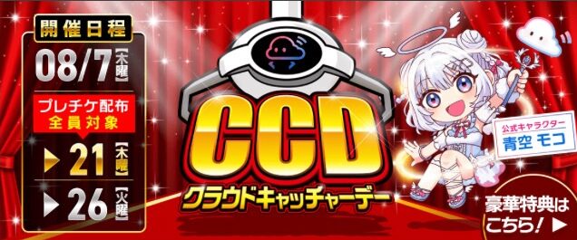日付に関しては毎月変動するので月初のお知らせを要チェックなのですが、クラウドキャッチャーデーは主に「無料チケット配布」&「チャージボーナス増量」という2種の恩恵を受けられます