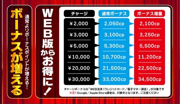 チャージボーナスに関しては、課金時に通常日よりもボーナスポイントが上乗せされるイベントですね!
