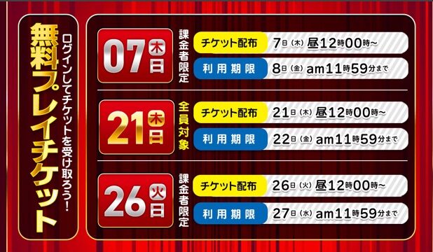 無料チケット配布はその時々で課金者のみ・無課金者も対象といった条件が付いていることもありますが、対象者の場合は当日の昼12:00以降にログインするだけで無料チケットがもらえちゃう激アツ日