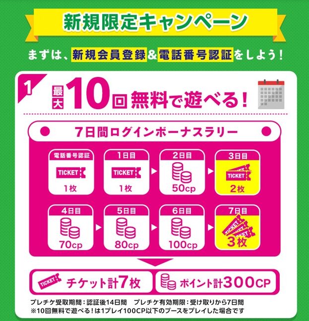 ”最大”とあるので何か条件がある風にも感じちゃいますが、実情は電話番号認証後の14日間以内にログインするだけで無料チケット7枚と300ポイントがもらえるという甘々システムですね!