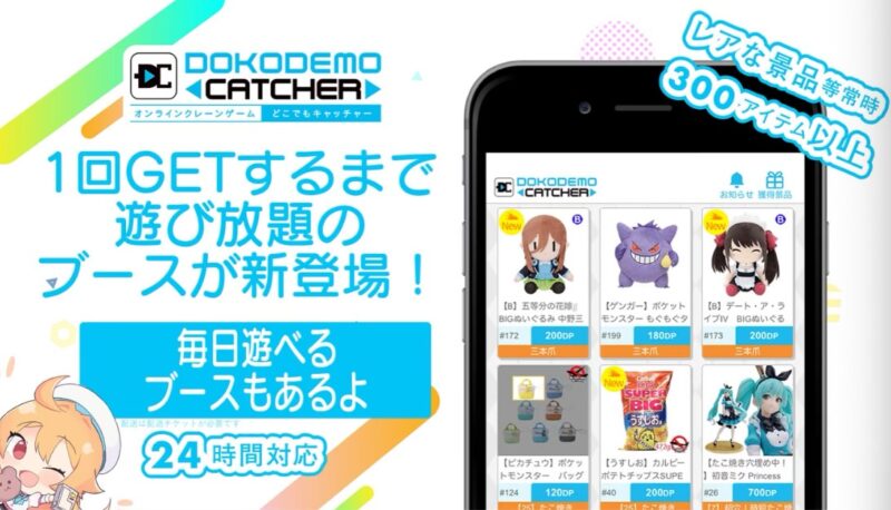 どこでもキャッチャーは他とは少々ベクトルの違う初回特典で、登録後1回獲得するまで遊び放題のブースが新登場