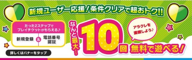 アラクレは今なら初回特典で無料チケット10枚がもらえます!