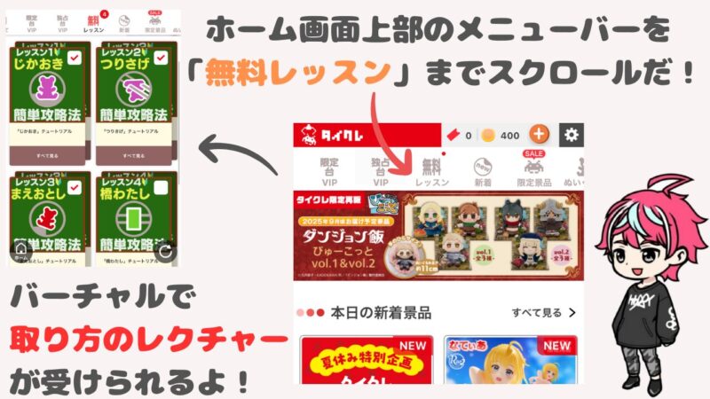 オンクレ他社にはほぼない独自機能なのですが、タイクレには取り方をゲーム感覚で教えてくれる「無料レッスン台」というものが用意されています!